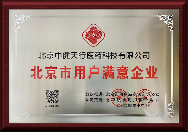 近日,北京市社會企業(yè)質(zhì)量協(xié)會公布2024年第八批 “北京市用戶滿意企業(yè)”名單,北京中健天行醫(yī)藥科技有限公司成功入選,獲得“北京市用戶滿意企業(yè)”榮譽(yù)稱號。