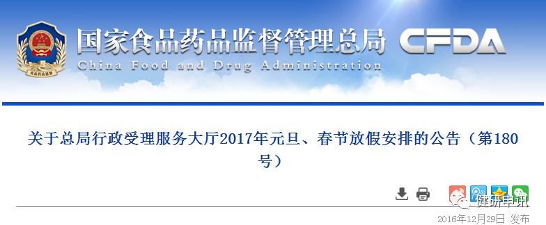 根據(jù)《國務(wù)院辦公廳關(guān)于2017年部分節(jié)假日安排的通知》,國家食品藥品監(jiān)督管理總局行政受理服務(wù)大廳元旦、春節(jié)放假安排如下:
