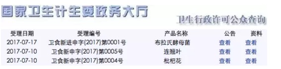 2017年07月20日,國家衛(wèi)計委新食品原料受理系統(tǒng)又有最新動態(tài)。此次受理的新食品原料為枇杷花、連翹葉、布拉氏酵母菌,受理編號依次為:衛(wèi)食新申字(2017)第0004號、衛(wèi)食新申字(2017)第0005號、衛(wèi)食新進申字(2017)第0001號,擬公告內(nèi)容: