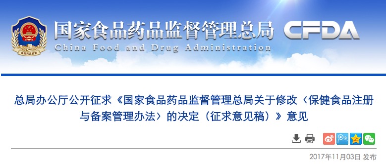 現(xiàn)向社會(huì)公開征求意見。請(qǐng)于2017年11月20日前將有關(guān)意見以電子郵件形式反饋至國家食品藥品監(jiān)督管理總局特殊食品注冊(cè)管理司。