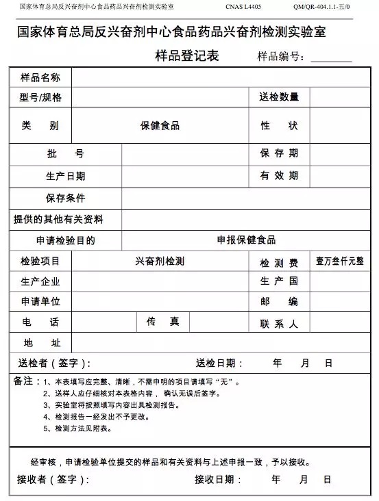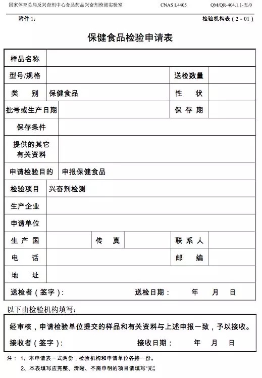 (二)《保健食品檢驗(yàn)申請(qǐng)表》(見附件二)和《國家體育總局反興奮劑中心食品藥品興奮劑檢測(cè)實(shí)驗(yàn)室樣品登記表》(見附件三)的填寫