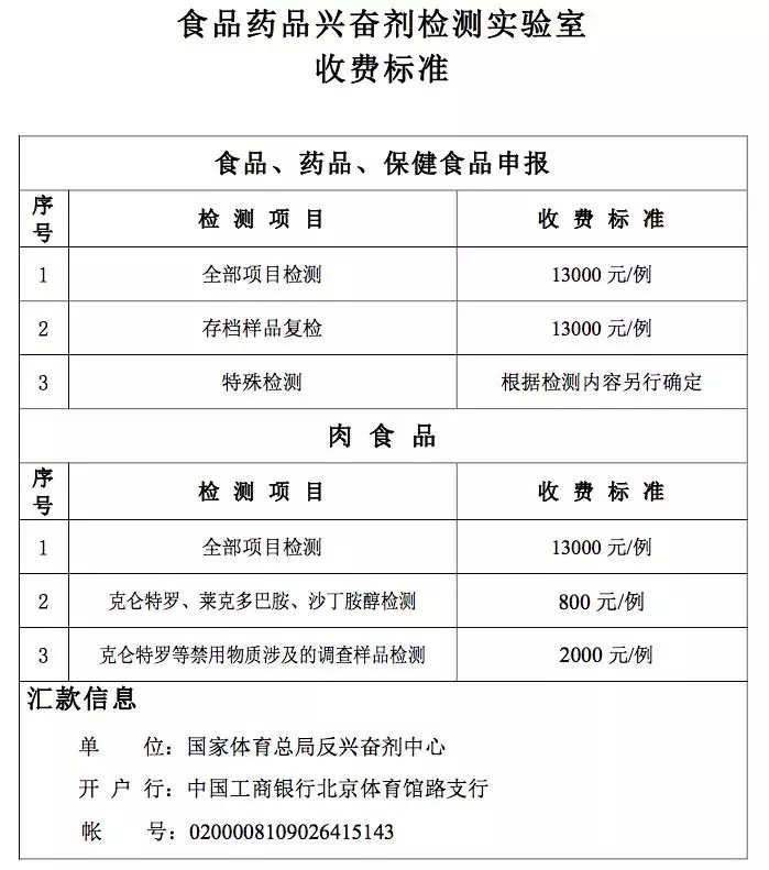 請(qǐng)按照《食品藥品興奮劑檢測(cè)實(shí)驗(yàn)室收費(fèi)標(biāo)準(zhǔn)》(見附件四)匯款,以單位名義匯款應(yīng)提供納稅人識(shí)別碼;若以個(gè)人名義匯款,應(yīng)在附言中注明發(fā)票抬頭及納稅人識(shí)別碼。