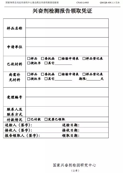 檢測(cè)費(fèi)到賬后,樣品完成受理,進(jìn)行興奮劑檢測(cè)。樣品檢測(cè)完畢后將盡快電話通知,領(lǐng)取檢測(cè)報(bào)告時(shí),請(qǐng)攜帶《興奮劑檢測(cè)報(bào)告領(lǐng)取憑證》(見附件五)。