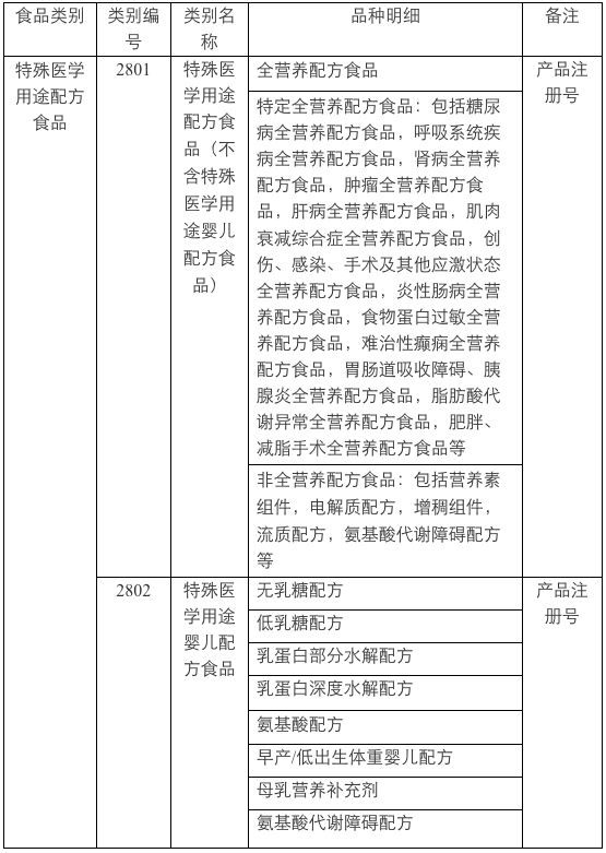 第二條 特殊醫(yī)學(xué)用途配方食品申證類(lèi)別名稱(chēng)分為:特殊醫(yī)學(xué)用途配方食品(不含特殊醫(yī)學(xué)用途嬰兒配方食品),類(lèi)別編號(hào)2801;特殊醫(yī)學(xué)用途嬰兒配方食品,類(lèi)別編號(hào)2802。特殊醫(yī)學(xué)用途配方食品生產(chǎn)許可食品類(lèi)別、類(lèi)別名稱(chēng)、品種明細(xì)等見(jiàn)表1。