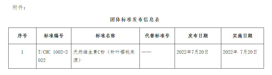 根據(jù)《中國(guó)保健協(xié)會(huì)團(tuán)體標(biāo)準(zhǔn)管理辦法(試行)》相關(guān)規(guī)定,《天然維生素C粉(針葉櫻桃來(lái)源)》團(tuán)體標(biāo)準(zhǔn)經(jīng)立項(xiàng)、起草、征求意見(jiàn)、審查等標(biāo)準(zhǔn)制訂程序,并通過(guò)中國(guó)保健協(xié)會(huì)批準(zhǔn),現(xiàn)予以發(fā)布。