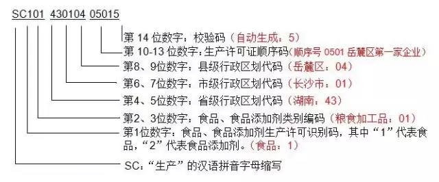 一、食品生產(chǎn)許可證編號(hào)由SC(“生產(chǎn)”的漢語拼音字母縮寫)和14位阿拉伯?dāng)?shù)字組成。數(shù)字從左至右依次為:3位食品類別編碼、2位省(自治區(qū)、直轄市)代碼、2位市(地)代碼、2位縣(區(qū))代碼、4位順序碼、1位校驗(yàn)碼。