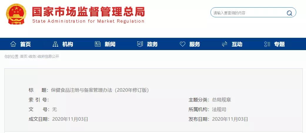 第六十五條 除涉及國(guó)家秘密、商業(yè)秘密外,市場(chǎng)監(jiān)督管理部門應(yīng)當(dāng)自完成注冊(cè)或者備案工作之日起20個(gè)工作日內(nèi)根據(jù)相關(guān)職責(zé)在網(wǎng)站公布已經(jīng)注冊(cè)或者備案的保健食品目錄及相關(guān)信息。