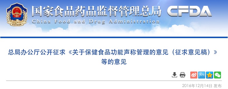 為全面貫徹落實新修訂的《中華人民共和國食品安全法》,進一步規(guī)范保健食品功能聲稱,保障消費者權(quán)益,食品藥品監(jiān)管總局研究起草了《關(guān)于保健食品功能聲稱管理的意見》(征求意見稿)以及緩解視疲勞、增強免疫力、抗氧化等3個保健功能的名稱及釋義(征求意見稿),現(xiàn)公開征求修改意見和建議。請社會各界積極參與研究并于2016年12月30日前將相關(guān)意見和建議反饋我局。