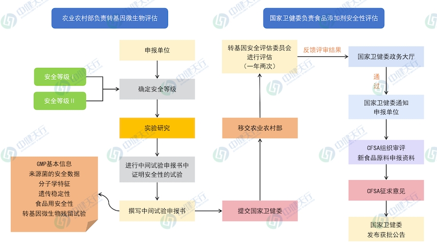 食品添加劑申報(bào)部分按照食品添加劑新品種的相關(guān)規(guī)定進(jìn)行審批與安全性評(píng)價(jià),相關(guān)的管理規(guī)定主要包括《食品安全法》、《食品添加劑新品種管理辦法》、《食品添加劑新品種申報(bào)與受理規(guī)定》等,轉(zhuǎn)基因微生物安全評(píng)估主要參考《動(dòng)物用轉(zhuǎn)基因微生物安全評(píng)價(jià)指南》的相關(guān)規(guī)定,申請(qǐng)人按照上述規(guī)定準(zhǔn)備申報(bào)材料,向國(guó)家衛(wèi)生健康委員會(huì)提出受理申請(qǐng),首先由農(nóng)業(yè)農(nóng)村部評(píng)價(jià)轉(zhuǎn)基因菌種的安全性,然后由國(guó)家衛(wèi)生健康委員會(huì)評(píng)價(jià)轉(zhuǎn)基因微生物食品添加劑新品種的安全性和工藝必要性。具體申報(bào)流程如下: