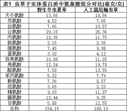 由表1可知:與野生冬蟲(chóng)夏草相比,人工培養(yǎng)蛹蟲(chóng)草的子實(shí)體中的氨基酸組成完全一致,但不同氨基酸的含量及氨基酸的總量存在一定差異。蛹蟲(chóng)草子實(shí)體中的氨基酸總量高。