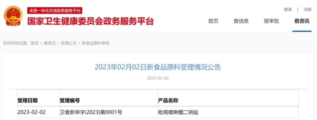 2023年2月2日,國家衛(wèi)健委發(fā)布吡咯喹啉醌二鈉鹽(PQQ)受理公告,受理編號:衛(wèi)食新申字(2023)第0001號,這是2023年第一個被受理的新食品原料,此前,PQQ在2022年3月于國家衛(wèi)健委2022年第1號公告中已經(jīng)被批準(zhǔn)為新食品原料,其生產(chǎn)工藝是化學(xué)合成法,可應(yīng)用于飲料領(lǐng)域。