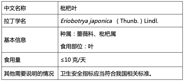2014年12月19日,國家衛(wèi)生和計劃生育委員會發(fā)布《關于批準番茄籽油等9種新食品原料的公告(2014年第20號)》正式批準枇杷葉為新食品原料,并對其食用部分、食用量等作出以下規(guī)定:
