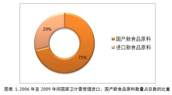 通過對(duì)國(guó)家衛(wèi)生計(jì)生委衛(wèi)生行政許可公眾查詢數(shù)據(jù)庫的信息檢索分析后,筆者發(fā)現(xiàn)2009年至2016年共七年間,截至2016年10月28日,國(guó)家衛(wèi)計(jì)委共公開受理新食品原料申報(bào)251件,其中29%申報(bào)的新食品原料為進(jìn)口,71%的為國(guó)產(chǎn) (圖表 1)。絕大多數(shù)申報(bào)的新食品原料為中國(guó)本土資源,側(cè)面體現(xiàn)了我國(guó)有豐富的資源值得食品行業(yè)開發(fā)和利用。