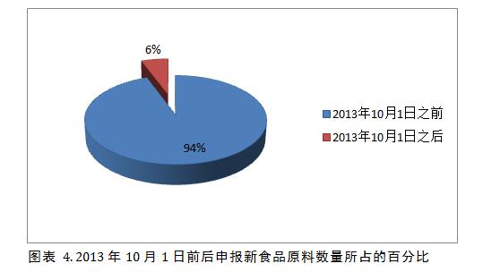 《新食品原料安全性審查管理辦法》于2013年2月5日經(jīng)原衛(wèi)生部部務(wù)會(huì)審議通過,自2013年10月1日起施行。換言之,2013年10月1日以后,國(guó)家將按照新的審查管理辦法來管理新食品原料申報(bào)。新的政策初步執(zhí)行階段,國(guó)家會(huì)在相當(dāng)一段長(zhǎng)的時(shí)間內(nèi)展開一些法規(guī)宣講會(huì)和政策解讀會(huì),幫助企業(yè)、檢測(cè)機(jī)構(gòu)、各相關(guān)政府部門明確各自的角色和職能,各方從而更快地適應(yīng)新的法規(guī)。這樣的情況下,更多的企業(yè)會(huì)選擇在新法規(guī)頒布前按照舊辦法加速提交申報(bào),而很少有企業(yè)在新法規(guī)政策執(zhí)行不明朗的情形下貿(mào)然提交申請(qǐng),做‘第一個(gè)吃螃蟹的人’。94%的企業(yè)選擇在2013年10月1日前提交申報(bào) (圖表 4),恰好就是企業(yè)選擇先觀望的很好的說明,也解釋了為什么2013年成為新食品原料申報(bào)的‘黃金年代’。