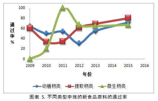 申報(bào)的不同類型的新食品原料通過率確實(shí)大相徑庭??傮w來看,提取物類和動(dòng)植物類的新食品原料的通過率在近7年內(nèi)趨勢(shì)相似且穩(wěn)中有升。2009年至2011年間,申報(bào)動(dòng)植物類的通過率略高于提取物類;2012年之后,提取物類的新食品原料通過率一直高于動(dòng)植物類;2009年申報(bào)的微生物類的新食品原料截至目前沒有任何獲得公告或通過專家評(píng)審會(huì),但是在隨后的兩年內(nèi)申報(bào)的微生物新食品原料通過率一路高歌,2011年3個(gè)申報(bào)的微生物類新食品原料全部獲得國(guó)家衛(wèi)計(jì)委新食品原料的公告(表格 3)。隨后的幾年中,申報(bào)微生物類新食品原料的通過率相比于2011年雖有下降,但仍然保持在較高的水平,與提取物和動(dòng)植物類的通過率不相上下。2015年申報(bào)的提取物類、動(dòng)植物類和微生物類的新食品原料的通過率分別為80%,71%,和67%??梢钥闯觯髀菲髽I(yè)對(duì)于新法規(guī)和政策的理解與執(zhí)行進(jìn)一步加強(qiáng),申報(bào)質(zhì)量穩(wěn)步提高。