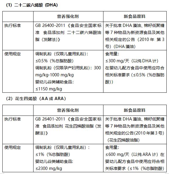《食品營養(yǎng)強化劑使用標準》(GB 14880-2012)問答中指出,“對于部分既屬于營養(yǎng)強化劑又屬于新資源食品的物質(zhì),如二十二碳六烯酸、低聚半乳糖、多聚果糖、花生四烯酸等,如果以營養(yǎng)強化為目的,其使用應(yīng)符合本標準的要求;如果作為食品原料,應(yīng)符合新資源食品相關(guān)公告的規(guī)定。”