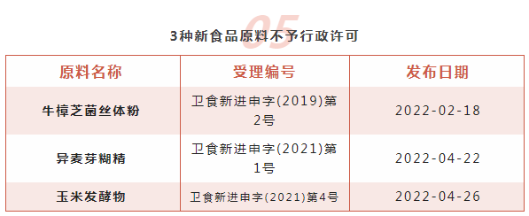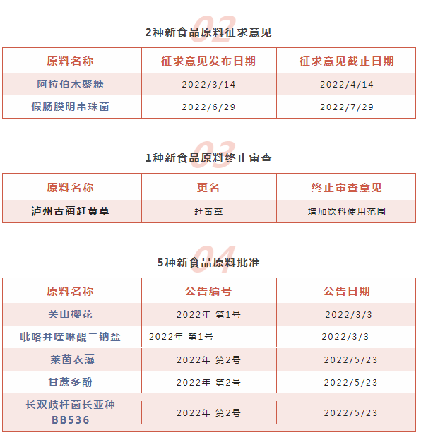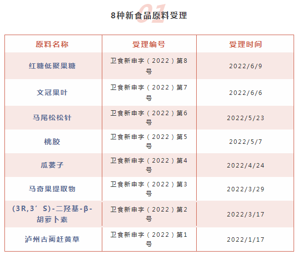 2022年1-7月,國家衛(wèi)生健康委員會(huì)共受理瀘州古藺趕黃草、馬尾松松針、桃膠、紅糖低聚果糖等8種新食品原料;對(duì)假腸膜明串珠菌、 阿拉伯木聚糖2種新食品原料進(jìn)行意見征求;批準(zhǔn)5種新食品原料,分別是關(guān)山櫻花、吡咯并喹啉醌二鈉鹽、萊茵衣藻、長雙歧桿菌長亞種BB536、甘蔗多酚;不予行政許可的新食品原料有3種,分別是牛樟芝菌絲體粉、異麥芽糊精、玉米發(fā)酵物。
